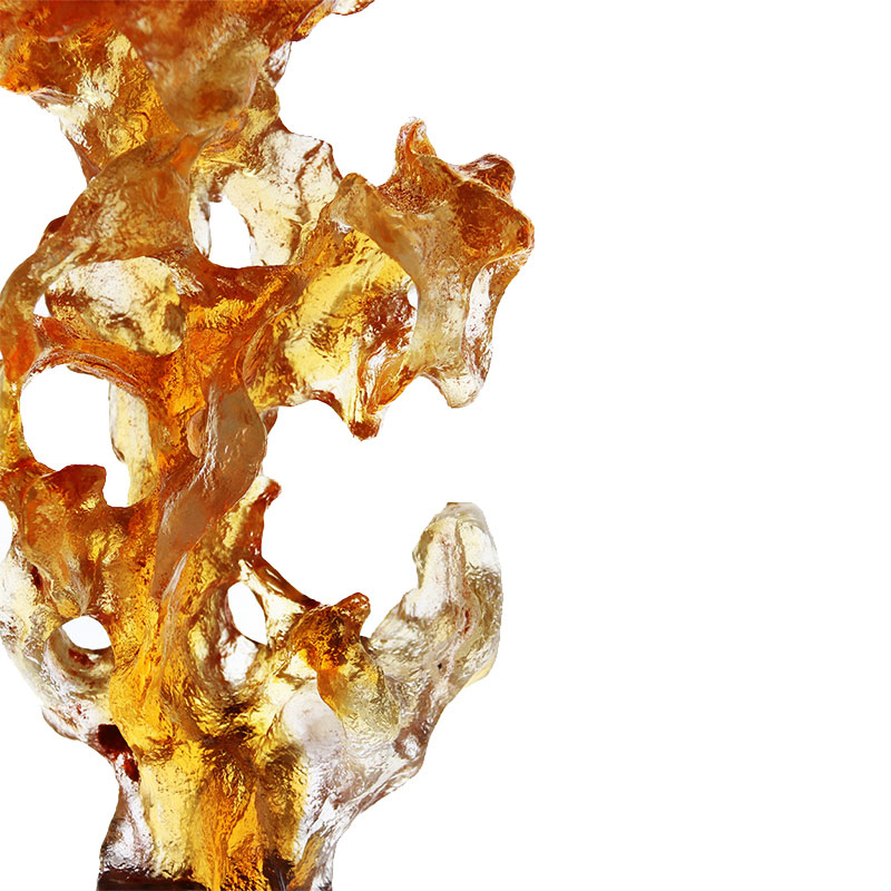 По форме эта элегантная игрушка из цветной глазури похожа на горящее пламя или танцующий шелк, с плавными и динамичными линиями. Каждый изгиб и поворот изображены подробно, демонстрируя энергичную жизненную силу. Черная основа внизу красиво оформлена, дополняет основную часть цветной глазури и играет хорошую роль в оттенке. Цветная глазурь сама по себе обладает характеристиками кристальной чистоты и красочности, и эта изящная игрушка как нельзя лучше демонстрирует эти преимущества цветной глазури. В работе преобладает золото, демонстрирующее благородный и элегантный темперамент, словно закрепляющее блеск солнца.