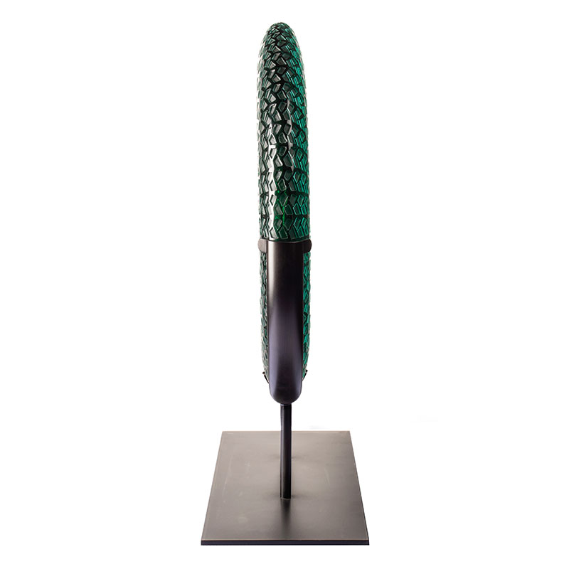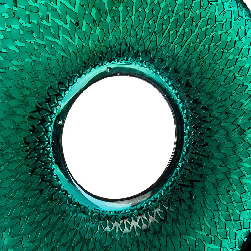 В качестве естественного вдохновения для работы использованы листья бамбука, передающие неземной дух зеленого бамбука, покачивающегося на лесном ветру. Сквозь полупрозрачность стекла он создает тысячи мерцающих отражений бамбука. Этот оттенок зеленого синего олицетворяет как свежесть бамбуковых рощ перед испарением утренней росы, так и мягкую грацию течения времени. Замысловатые узоры, похожие на раскрывающиеся прожилки листьев бамбука, колеблются слоями света, танцующего по поверхности, улавливая дикий горный дух в круглой рамке.