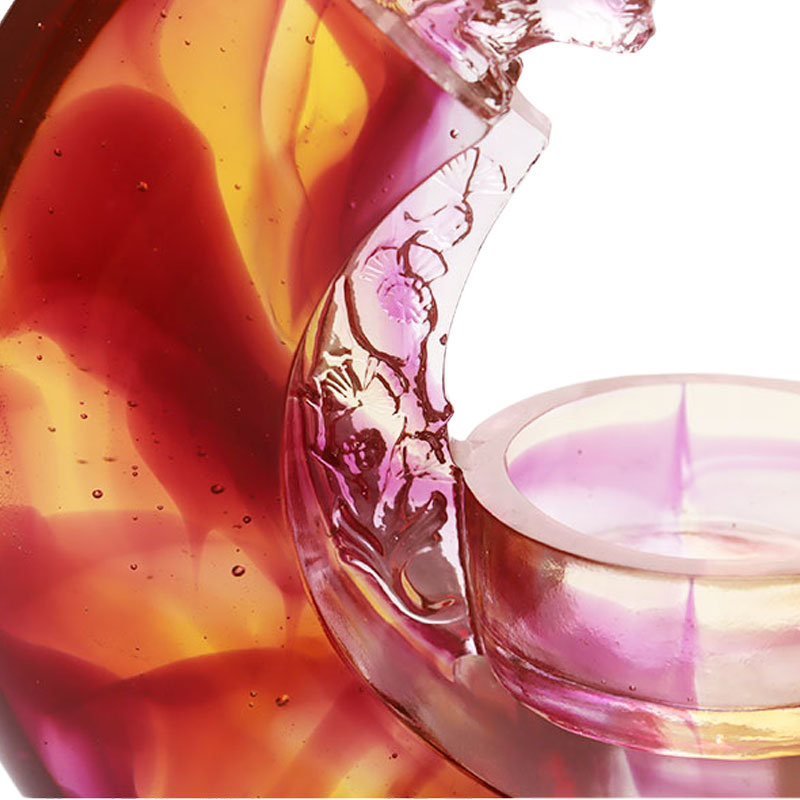 Цветная глазурь придает подсвечнику сказочную текстуру. Его цвета прекрасны, как закат. Красный, желтый и фиолетовый цвета смешиваются друг с другом, а плавные цвета словно останавливают время в этот чудесный момент. Переход каждого цвета естественный и плавный, демонстрирующий неповторимое очарование цветной глазури. Форма подсвечника оригинальна, с серповидным узором с обеих сторон, плавными линиями и напряженностью, как бы передающими элегантный ритм. Изысканная резьба на верхушке изящна и ярка, как эльфы, охраняющие свет свечей, добавляя ощущение загадочности и подвижности всему подсвечнику. Часть посередине, где расположена свеча, изысканно оформлена, практична и красива и желательно интегрирована в общую форму. С точки зрения мастерства этот подсвечник из цветной глазури олицетворяет очень высокий уровень производства. Прозрачность и блеск цветной глазури доведены до совершенства, и каждая деталь обработана идеально, без малейших изъянов. Независимо от того, используется ли он в качестве подсвечника или выставлен как самостоятельное произведение искусства, он может источать опьяняющее очарование и подчеркивать уникальную ценность искусства цветной глазури.